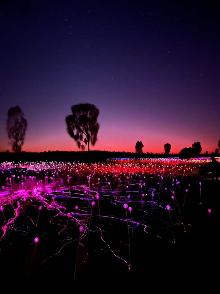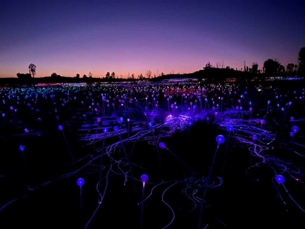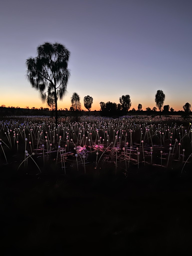 As I wandered and reflected, I could feel that each viewing of Field of Light was unique, as each light changed second by second. In contrast, Uluru, having been here for hundreds of millions of years, stood quiet and resilient somewhere in the distance. As we traveled the paths, we could see more and more, glorious pinks and purples on the horizon, a sign of the sun’s arrival. But little by little, the 50,000 solar lights, were starting to lose their energy and brilliance. They would be dim soon until the blazing Australian sun would charge their cells once again.