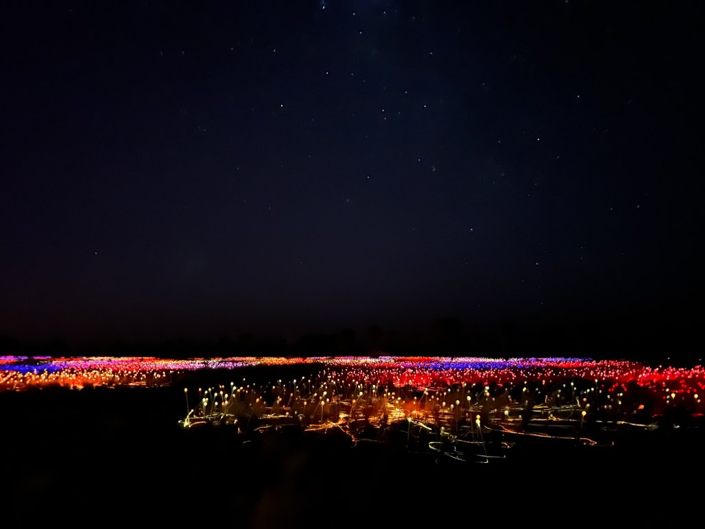 As we exited the bus, small white lights lit up a visible short path, headed into blackness. We followed each other, one by one in our group until we came upon a rainbow of light sprinkled off in the distance. Field of Light.