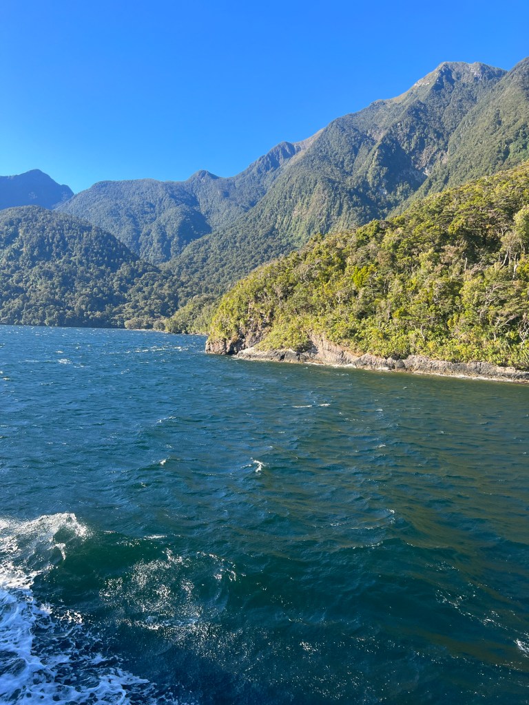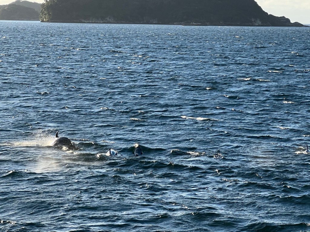 Our overnight boat cruise of 58 passengers in Fjordlands National Park was setting sail out of the glacially-formed, remote Doubtful Sound in New Zealand, into the Tasman Sea. To get here, we had taken a 45 minute cruise in a catamaran across Lake Manapouri, followed by a 45 minute bus ride over the steepest commercial road in New Zealand, through dense rainforests across Wilmot Pass. We were nowhere close to anyone.