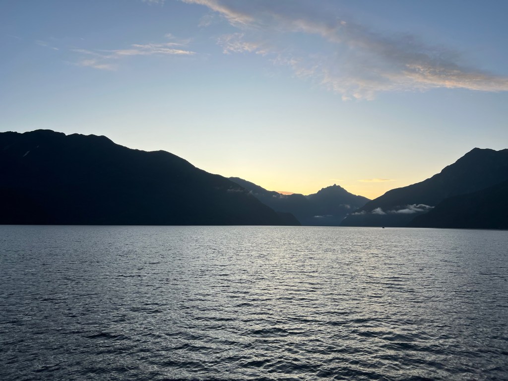 The following morning, our boat traveled up into the quiet Hall Arm of the sound, for a ‘moment of silence’. As we pulled up facing the carpeted green fjord, the fjord’s mirror image flipped onto the still water, the captain said he was going to turn off the engine and the generator. He asked us to sit down and not move for 10 minutes. He wanted us to soak all this beauty in, in silence.